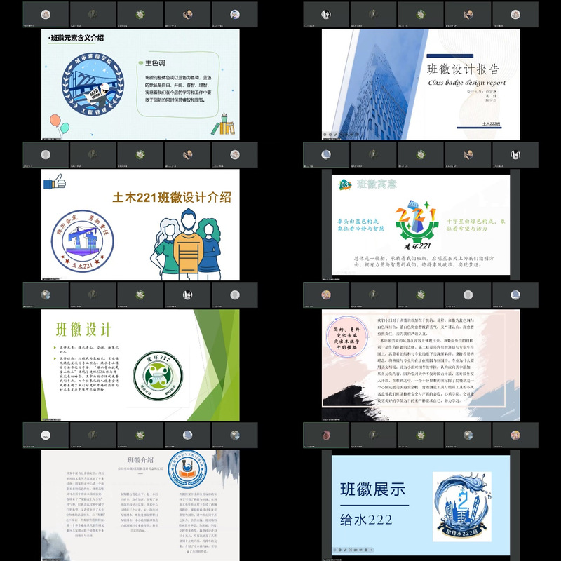 答辩中,各班代表通过ppt的形式从“班级风貌”、“班徽设计理念”、“未来展望”等方面入手,结合专业特色、班级文化,向大家呈现班徽的文化意蕴和精神内涵。同学们以独特的灵感与多彩的展现力,运用多变的线条与丰富的色彩,或素笔勾勒,或浓墨重彩,赋予班徽博大精深的专业内涵,蓬勃向上的青春朝气以及真挚热忱的理想寄托。最后通过线上投票和评委打分的综合计算,斩获比赛一等奖的班级是给水221班、土木222班,二等奖为给水222班、土木221班,其余班级荣获三等奖;其中,土木222班班主任蒋宏伟老师和建环222班班主任林建泉老师喜获最佳指导奖。