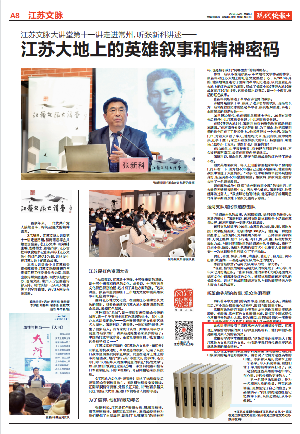 “江苏文脉大讲堂”携手常州青果思享会,邀请《江苏文库·研究编》主编、留德博士、著名作家、江苏省社科联党组书记张新科以《江苏文脉中的红色记忆》为题,旁征博引、生动形象的讲述发生在江苏大地上的革命故事。张新科表示,江苏是红色资源大省,周恩来精神、雨花英烈精神、新四军铁军精神、淮海战役精神为我们提供了丰厚滋养,是我们“从哪里来”的精神密码,也是指引我们“到哪里去”的精神路标。