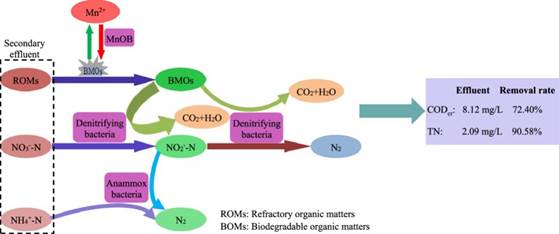 过量氮元素排入河道或湖泊等缓流水体会加速水体富营养化过程,为了减少氮元素的排放量,改善水环境质量,我国城镇污水处理厂TN的排放标准日趋严格。因此如何实现城镇污水高效、低成本深度脱氮成为当前研究的热点。基于此,程庆锋副教授等人在反硝化滤池中原位生成了生物锰氧化物,以其氧化二级出水中难降解有机物的产物作为碳源,在反硝化滤池中实现了部分反硝化-厌氧氨氧化与反硝化协同脱氮。该技术具有对TN和CODcr去除效果好、不需要外加碳源、运行成本低、不产生二次污染等优势。