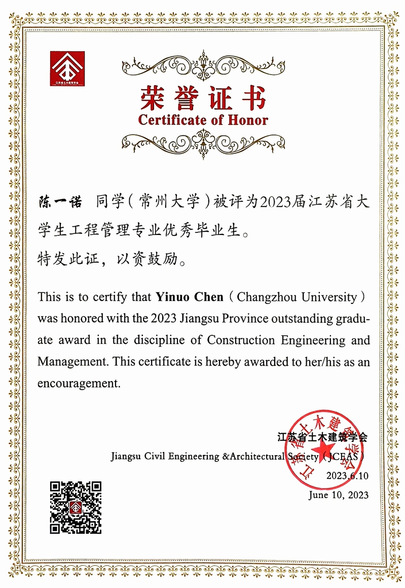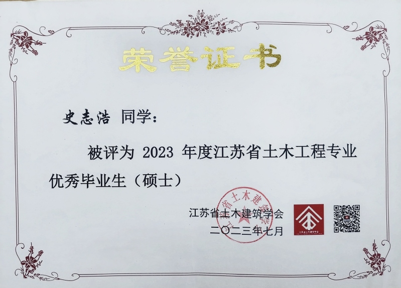 近日,从江苏省土木建筑学会传来喜讯,禁漫天堂 2023届本科毕业生土木工程专业俞文祺、蔡苑泓获评“2023年度江苏省土木工程专业优秀毕业生(本科)”,工程管理专业陈一诺获评“2023届江苏省大学生工程管理专业优秀毕业生”,硕士毕业生史志浩获评“2023年度江苏省土木工程专业优秀毕业生(硕士)”。硕士毕业生魏达的毕业论文《冻融环境碳化改性再生粗骨料多代利用效应研究》(指导教师:朱平华)被评为“2023年江苏省高等学校土木工程学科‘吕志涛院士’优秀学术硕士学位论文”。