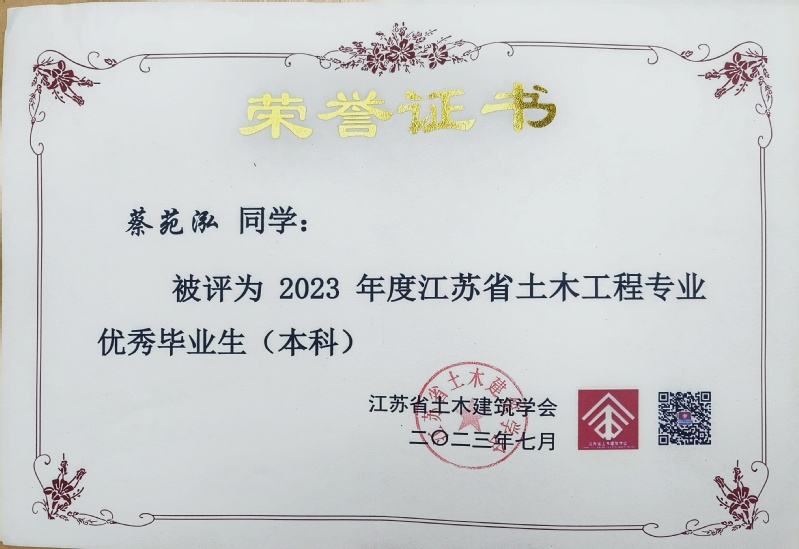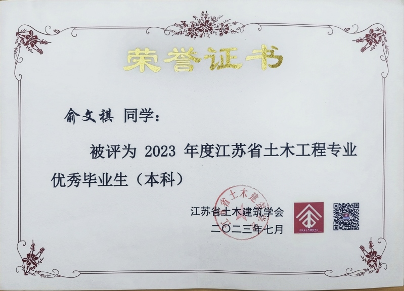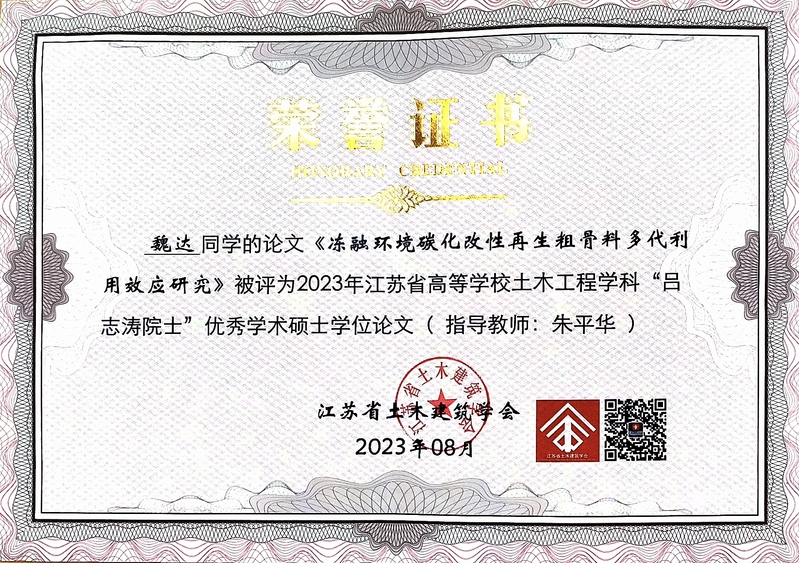 近日,从江苏省土木建筑学会传来喜讯,禁漫天堂 2023届本科毕业生土木工程专业俞文祺、蔡苑泓获评“2023年度江苏省土木工程专业优秀毕业生(本科)”,工程管理专业陈一诺获评“2023届江苏省大学生工程管理专业优秀毕业生”,硕士毕业生史志浩获评“2023年度江苏省土木工程专业优秀毕业生(硕士)”。硕士毕业生魏达的毕业论文《冻融环境碳化改性再生粗骨料多代利用效应研究》(指导教师:朱平华)被评为“2023年江苏省高等学校土木工程学科‘吕志涛院士’优秀学术硕士学位论文”。