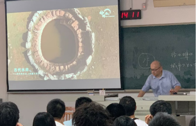 杜尔登老师从世界水资源及中国水资源的大背景入手。他详细介绍了水环境危机的现状,突出了给排水专业对于水资源利用及水循环的关键作用,帮助新生建立胸怀天下的责任感及使命感,增强了专业认同感。后通过一段视频,融汇内外,贯通古今,详细介绍了给排水专业的深远历史,地位及其关键作用;会议中杜尔登老师邀请两位同学分别介绍对于专业的认识,经过杜老师的补充,同学们认识到给排水科学与工程研究的是水的社会循环问题,包含两个方面,一方面是“给水”,将从江河湖泊中抽取的自然水经过净化成为符合生活用水标准的自来水,并输送到千家万户;一方面是“排水”,将使用过的污水、废水集中处理,然后干干净净地被排放到江河湖泊中。
