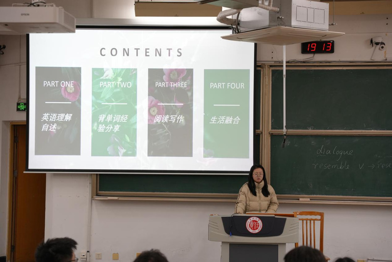 会议伊始,陆燕萍结合往年经验,重点讲解了大学生英语竞赛近几年的发展状况、奖项设置、题目特点及题型变化情况,并针对不同题型,介绍了具体的答题策略和备考思路。此外,为引导同学们高效答题,陆燕萍具体分析了竞赛中各题型的得分占比与题型特点,并将竞赛试题同高考、四六级等考试题型进行类比,帮助同学们对于大英赛题型有了进一步的了解与把握。会议最后,陆燕萍邀请在2023年英语竞赛中获得优异成绩的学姐上台为大家梳理常见考点,归纳写作技巧,在场的同学们均表示受益匪浅。