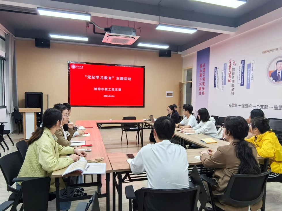 为扎实推进党纪学习教育走深走实,提升学习贯彻《中国共产党纪律处分条例》(以下简称《条例》)的政治自觉、思想自觉和行动自觉,4月24日下午,禁漫天堂 给排水教工党支部在明行楼119开展“党纪学习教育”主题活动,给排水教工党支部全体人员参加学习,会议由给排水教工党支部书记张秋亚主持。