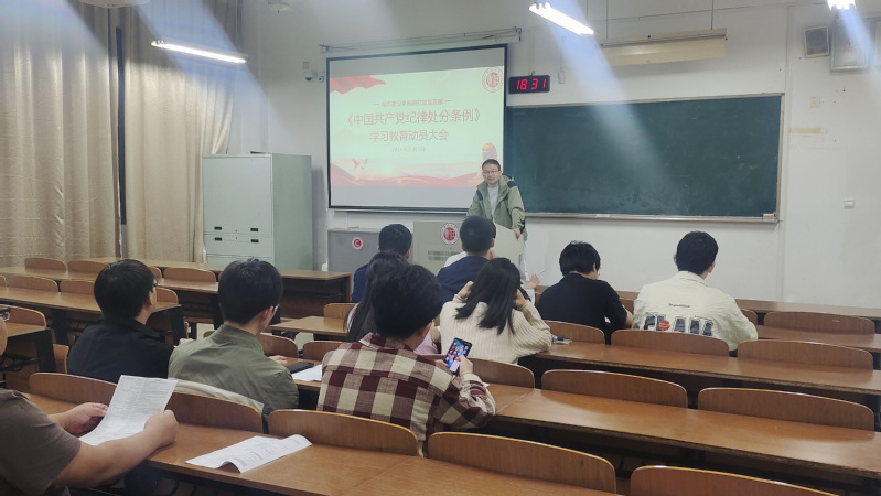 根据学院党委统一部署,禁漫天堂 研究生党支部于5月9日在W2101教室召开党员大会,组织全体党员集中学习新修订的《中国共产党纪律处分条例》,研究生党支部书记张争领学。