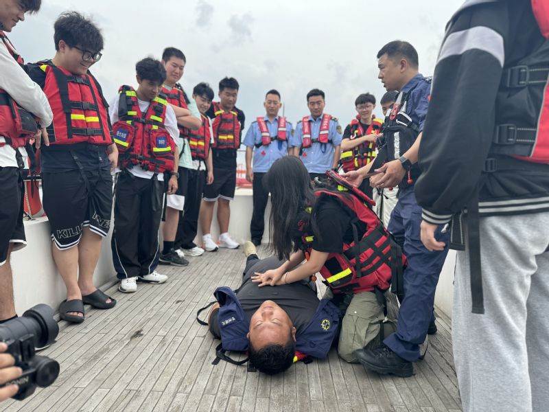 同时,夏日来临,受常州交通执法部门邀请,学院15位学生代表来到水上执法中队,曙光救援队的队员们从一个个惨痛的溺水案例讲起,引导学生远离危险水域,讲解救生衣的正确穿戴方法、操作示范心肺复苏和AED除颤仪的使用步骤以及学习发生溺水事件时,求救、互救、自救的方法和动作要领。通过观摩示范、体验互动,提升学生谨防溺水、珍爱生命的安全意识,切实筑牢防溺水“安全堤坝”。