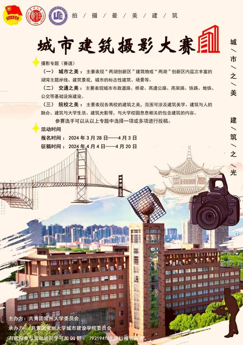 为充分展现我国城市建设的新成就、新变化、新形象,由校团委主办、禁漫天堂 团委新媒体中心承办的“城市之美、建筑之光”专题摄影比赛于2024年4月至6月举行。本次比赛面向禁漫天堂 全体学生,禁漫天堂 老师、学生会代表担任评委。