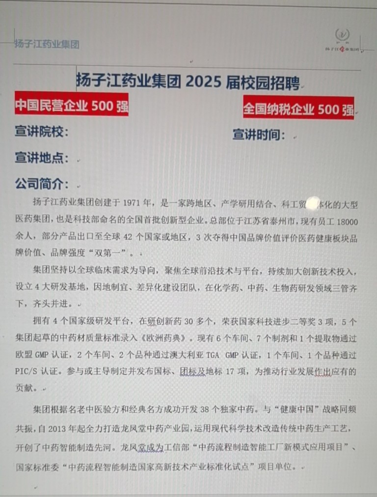 招聘[2024178]扬子江药业集团有限公司2025届校招