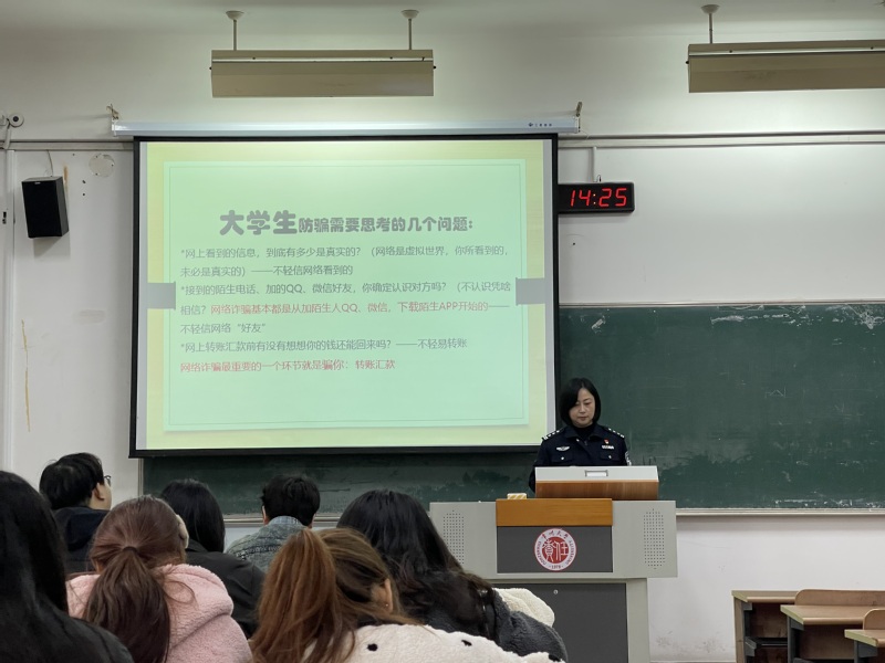 讲座开始,吴警官结合具体案例,深入浅出地为同学们讲解了电信网络诈骗的常见套路、危害以及防范措施。“如何有效避免在网络中被诈骗?”“大家有没有被骗的经历?”吴警官通过一系列的生活中常见问题,一一列举了高校常见的电信网络诈骗形式引发了同学们的强烈共鸣。同时,针对当下学生群体法律意识薄弱的问题,吴警官还强调了“帮助信息网络犯罪活动罪”(帮信罪)警示同学们切勿为了蝇头小利而成为犯罪“工具人”发生一次可能会毁掉一生前途讲座结束后,同学们纷纷表示,自己对电信网络诈骗有了更深刻的认识,也掌握了更多的防范技巧,今后一定会提高警惕,远离诈骗陷阱。