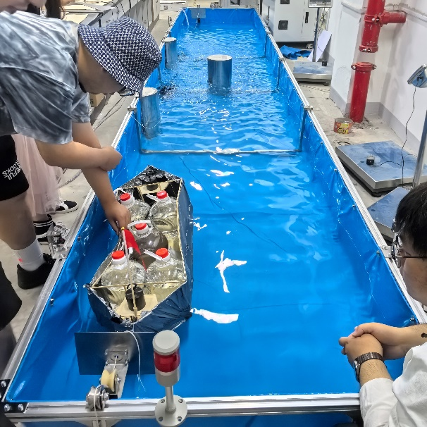本次竞赛以“乌篷船模型结构设计与制作”为主题。参赛团队首先进行模型尺寸测量、变形检查等规避区检验,并完成称重环节。随后,队员围绕船体设计理念、结构参数优化、力学性能分析等方面进行现场陈述与答辩。在模型加载测试阶段,各团队通过施加不同质量砝码、模拟波浪荷载(造浪装置)、绳套牵引等方式,综合考察船体的流线型设计、结构稳定性、抗冲击能力、承载性能及航行表现。评委专家从结构合理性、创新性、工艺质量等维度对各参赛作品进行了专业点评,并提出优化建议。模型展示组的作品充分体现了土木工程的核心力学原理、结构设计思维与创新实践能力。模型展示组参赛学生全程记录模型制作过程,并提交视频资料以佐证作品的原创性。此外,许多作品还融入了低碳环保、可持续设计理念,展现了新时代工程人才对绿色建造的前瞻性思考。