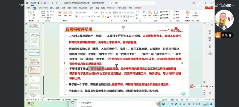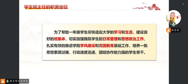 为加强新生班级管理队伍建设,提升学生班主任履职能力,保障2025级新生顺利适应大学生活,7月,禁漫天堂 线上召开2025级新生学生班主任培训会。培训聚焦工作实务,张争老师主持,全体辅导员参加并做寄语。
