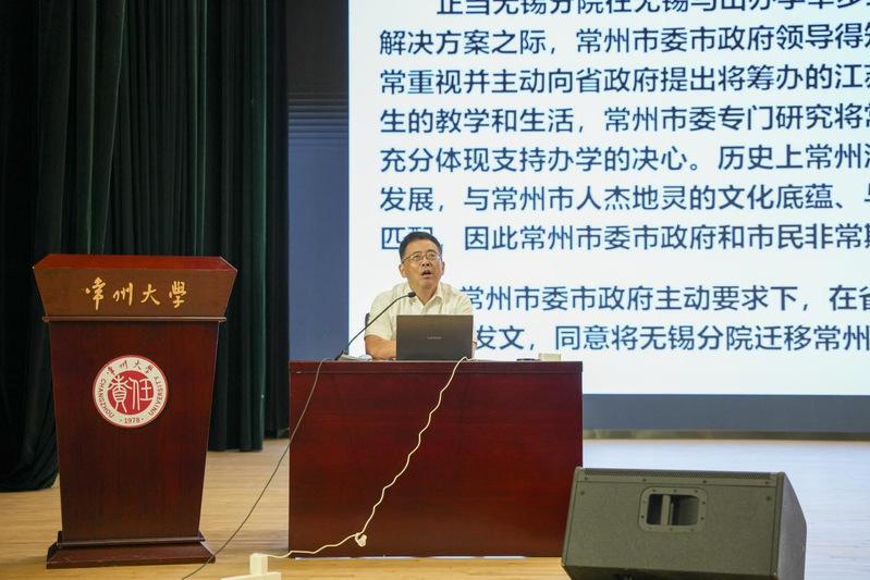作为与学校有“首届缘分”的亲历者,郭文昌以“创业维艰”、“薪火相传”、“时代新篇”为脉络,梳理常大自1978年创办至今的发展历程。他展示了南京化工学院常州分院时期的老照片,讲述惠浴宇等前辈为校奠基的故事,让新生直观感受校史起点的艰辛。结合校园内若愚亭的设计理念、惠浴宇铜像的细节,融合学校多次更名升级的历程、石油石化与城建领域的学科积淀,解析“百折不饶、自强不息”的常大精神在城建领域的具象体现。郭文昌讲述巧妙串联校史与专业发展,鲜活可触的校史让同学们听得津津有味。