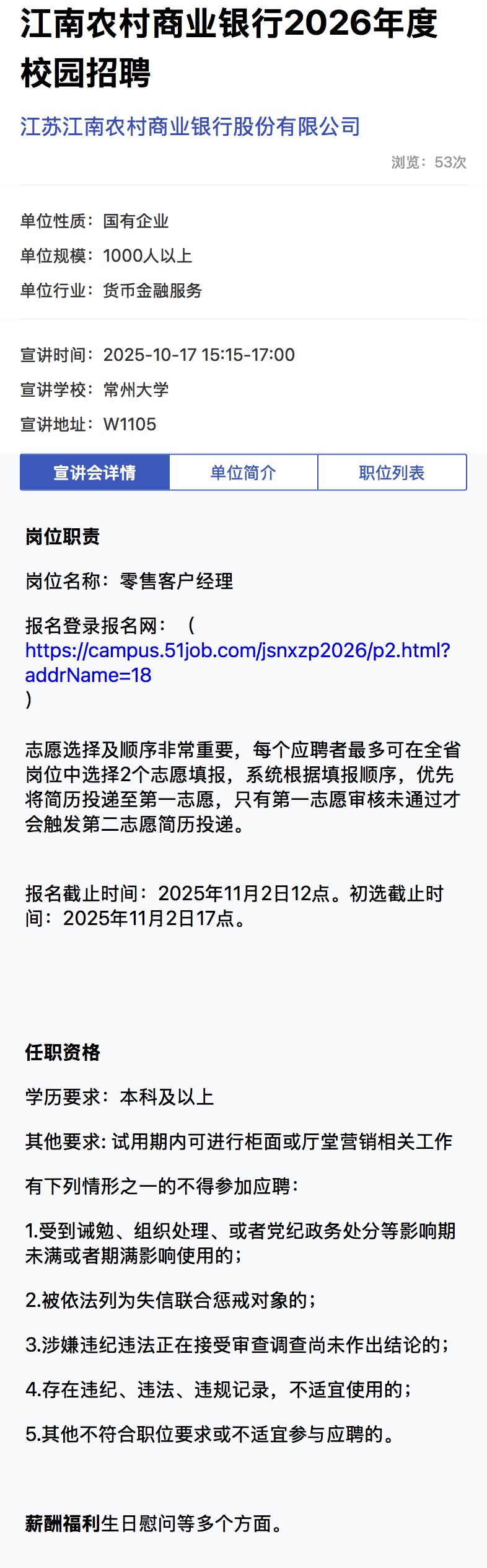 招聘宣讲会[2025027]江南农村商业银行2026年度校园招聘
