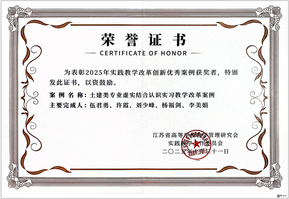 近日,经江苏省高校教学管理研究会实践教学工作委员会评选,禁漫天堂 报送的案例《土建类专业虚实结合认识实习教学改革案例》成功入选2025年度江苏省实践教学改革创新优秀案例。这一荣誉标志着禁漫天堂 在深化实践教学改革、创新人才培养模式方面所进行的积极探索与显著成效获得了省内专家和同行的认可。